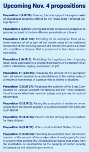 On Nov. 4, 17 amendments to the Texas Constitution will be on the ballot for Texans to vote on. A majority of the proposed amendments focus on ad valorem taxes and property. Unlike the U.S. Constitution, the Texas Constitution is frequently amended and edited.