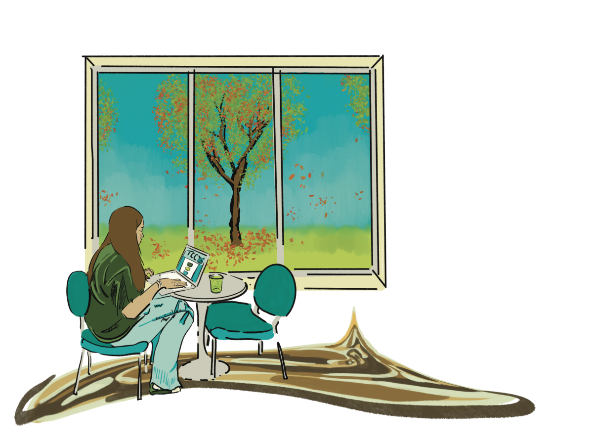 In the cafe, it is hard to find a corner without big windows that reflect the greenery outside.