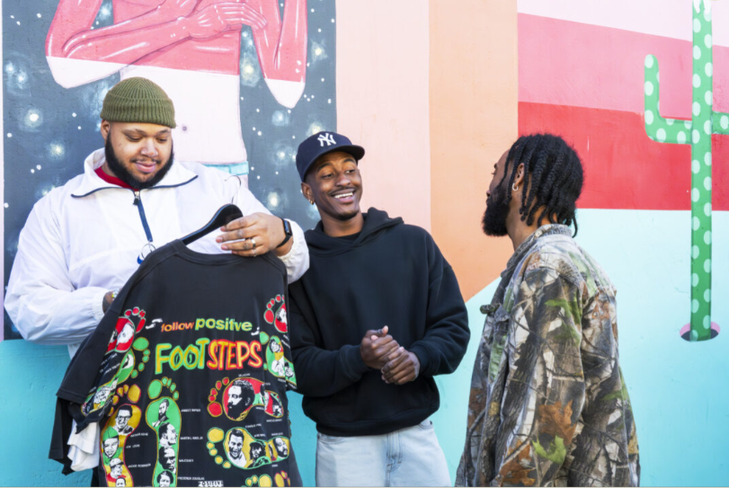 Jeremy Jackson and Lonnie Burts talk to Wesley Bobo about their vintage clothing businesses at Doc’s Records outdoor flea market. (KELLY AMTOWER)