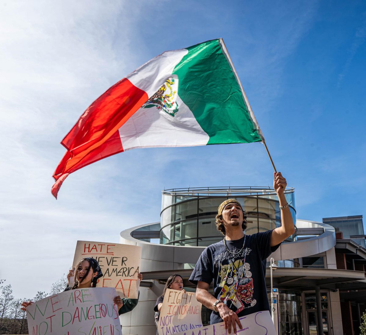 Holding signs that read “Hate never made America great,” “Fight ignorance not immigration” and “Families belong together” while blowing whistles, students stood outside for two hours during the first 80-degree day in months.
